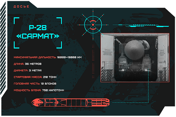 Точные характеристики комплекса засекречены. Известно тем не менее, что 200-тонный «Сармат» может преодолевать в полете около 16 тысяч километров. В зависимости от поставленной задачи, его нагрузка может включать несколько разделяющихся боеголовок общей мощностью несколько мегатонн в тротиловом эквиваленте. Это в разы больше, чем американцы обрушили на Хиросиму и Нагасаки, вместе взятые.