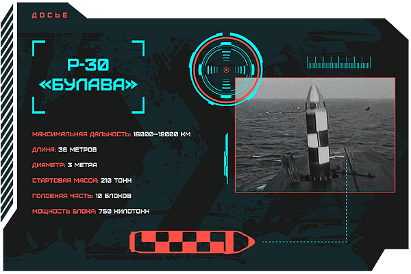 Принятая на вооружение в 2018 году «Булава» получила 1,1-тонную разделяющуюся боевую часть и может пролететь до цели 9,3 километра. Вооруженная такими ракетами субмарина, находясь в Тихом, Атлантическом или Северном Ледовитом океане, способна поразить практически любую цель на планете.