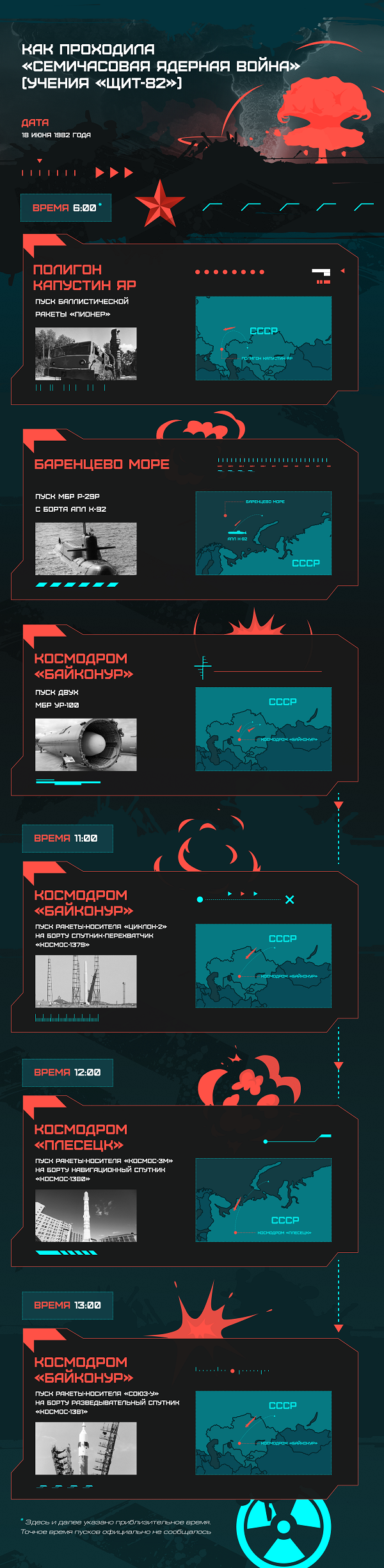 В общей сложности в тот судьбоносный день советскими войсками было выпущено девять баллистических ракет, противоракет и ракет-носителей, которые перед этим вывели в космос спутники-разведчики. Параллельно прошли успешные запуски ракет с бортов стратегических бомбардировщиков Ту-95 и Ту-160, а также с кораблей ВМФ СССР.