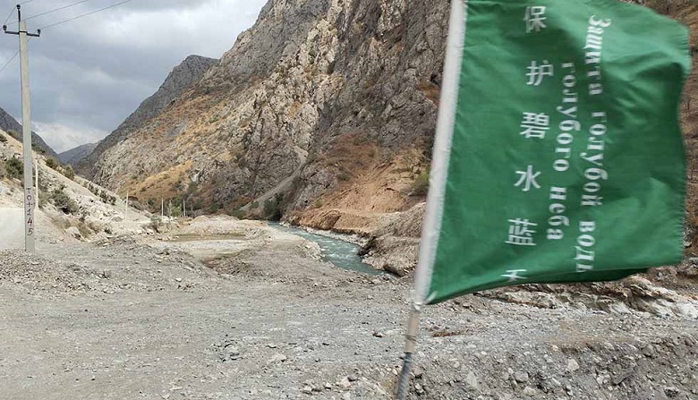 В нескольких метрах от флага бежит Аксу питьевого назначения. Она не только наполняет водохранилище для ирригации, не только крутит турбины сезонной Гиссаракской ГЭС. Люди пьют её воду выше и ниже по течению.