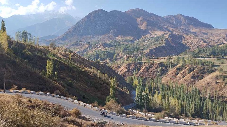 Аксу скоро свернёт в ущелье направо, а дорога в Гилан уходит круто вверх.