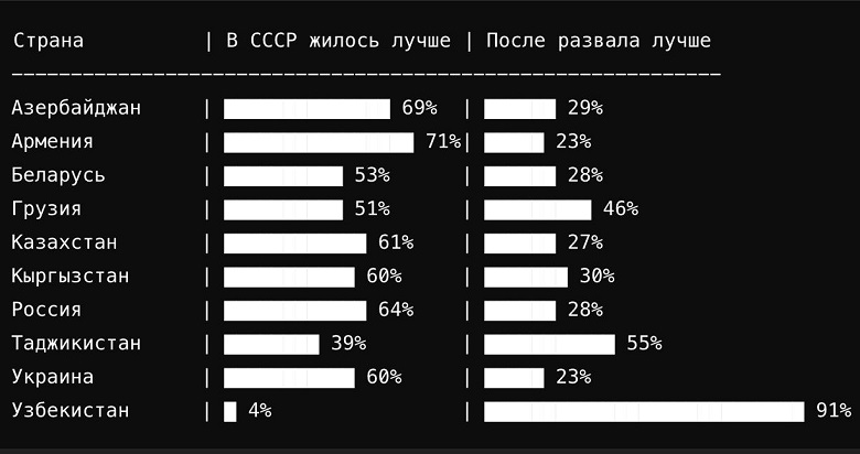 В 2016 году государственное издание Sputnik опубликовало опрос об отношении жителей стран бывшего СССР к советскому прошлому. Среди 11 государств, принявших участие в исследовании, только респонденты из Таджикистана и Узбекистана (старше 35 лет) заявили, что жизнь при независимости стала лучше (39% против 55% и 4% против 91% соответственно). В этих же странах проживает наименьший в регионе процент русского населения (данные за 2021 год).