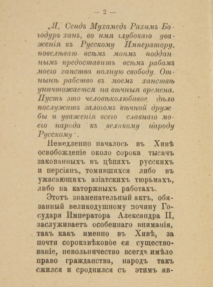 Цитировать текст не буду, ограничившись тем, что перескажу суть. Генерал фон Кауфман уже через две недели после взятия Хивы -12 июня 1873 года подписал документ, отменяющий рабство, процветавшее в Хивинском и Кокандском ханствах, а также в Бухарском эмирате. По свидетельствам очевидцев из заточения были освобождены сорок тысяч рабов, в том числе и этнических русских. Таким образом, спустя всего 12 лет после отмены крепостного права, Россия принесла свободу и в Среднюю Азию. Образно говоря, свобода пришла с севера. Оттуда, откуда её вряд ли ожидали.