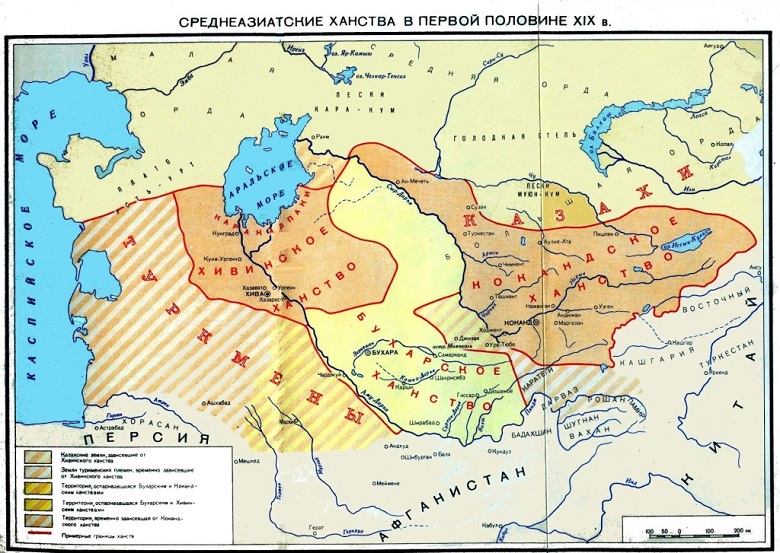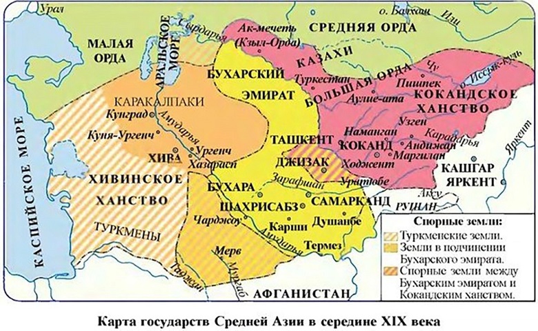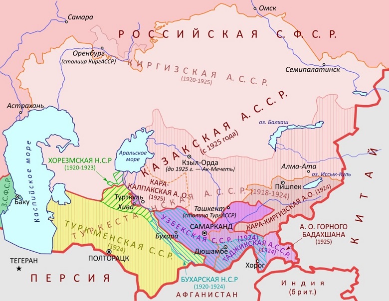 Вскоре произошли Первая мировая с крушением упомянутой выше султанской Турции, две революции в России, гражданская война – и по итогам всех этих социальных катастроф на территории, рассматриваемой младобухарцами как рабочий стол для формирования новой нации, была установлена единая по факту власть большевиков. Правда, очень неуклюже оформленная административно. Две «народные республики» – Хорезмская и Бухарская – располагались посреди Туркестанской автономии, при этом всё это вместе было под управлением Среднеазиатского бюро ВКП(б) и соответствующего Экономического Совета (Средазэкосо).