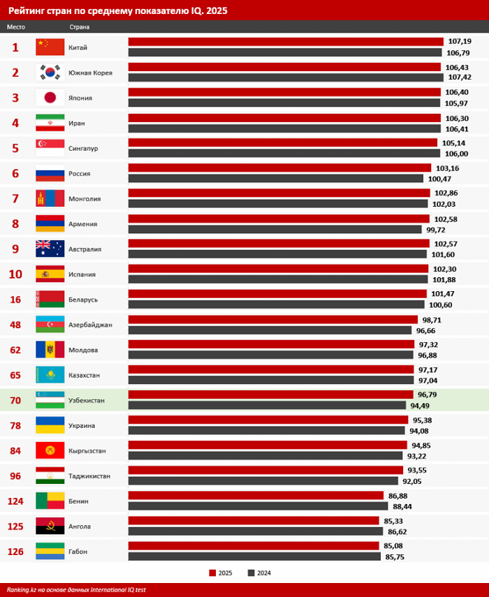 В рейтинге стран по среднему уровню IQ Узбекистан в 2025 году попал на 70-е место из 126.