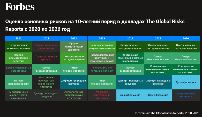 Ситуация мало изменилась и в 2026 году. Опрашиваемые, как уже отмечалось, оценивая перспективы на десять лет вперед, признали самыми серьезными рисками погодные явления, потерю биоразнообразия и критические изменения в системе Земли. Недостаток ресурсов оказался на шестом месте, а загрязнение — на десятом.