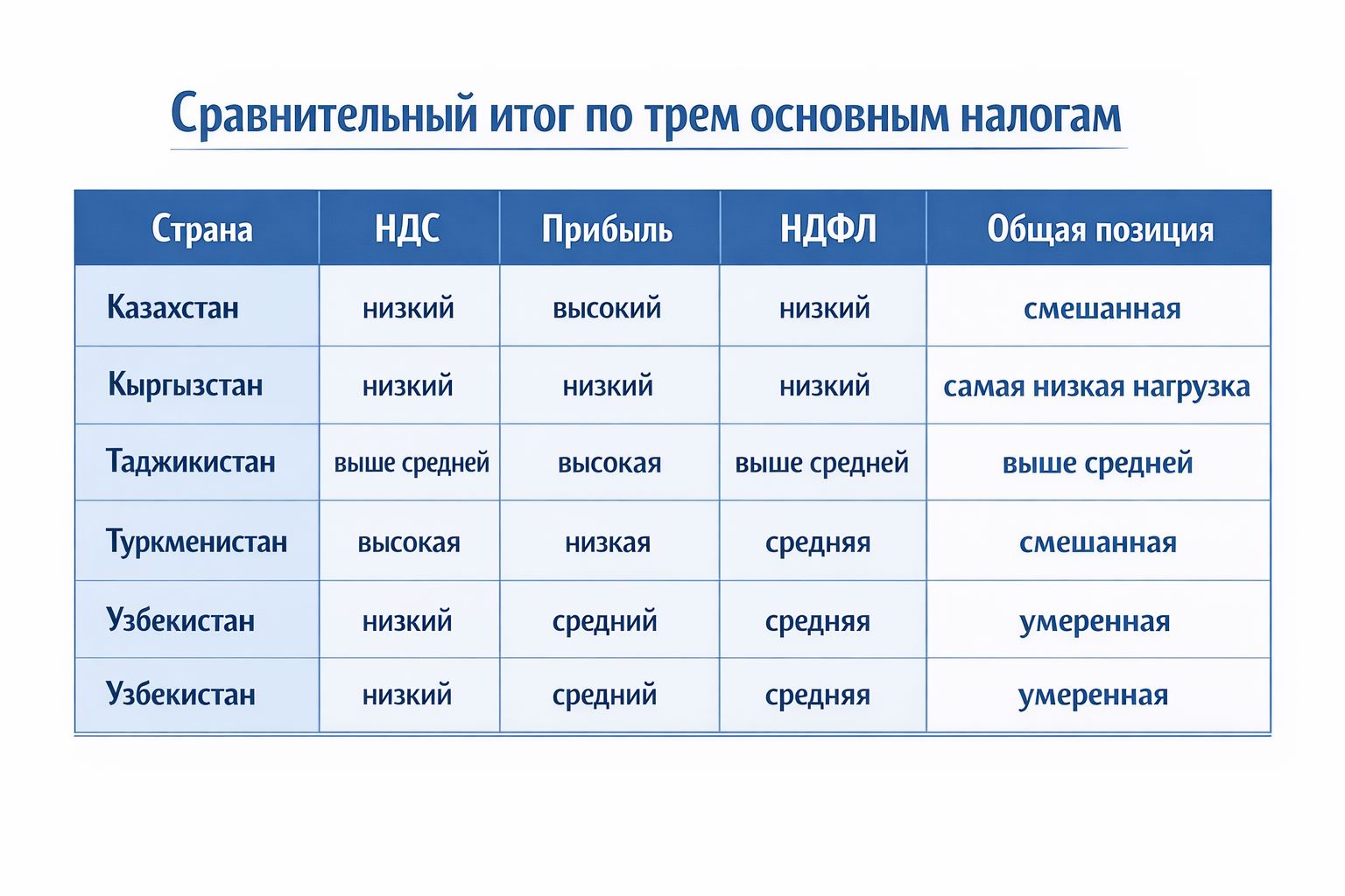 Таким образом, самая низкая совокупная налоговая нагрузка по трем ключевым ставкам — в Кыргызстане. Таджикистан находится выше среднего уровня по региону.